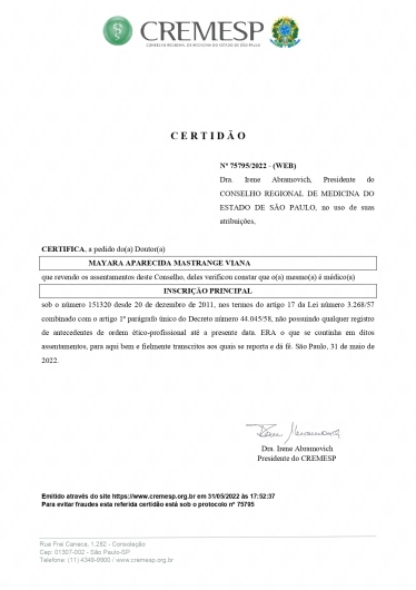 A Dra. Mayara Mastrange Viana é médica formada pela Faculdade de Medicina de Catanduva (FAMECA), com Residência Médica pela FAMEMA (Faculdade de Medicina de Marília).